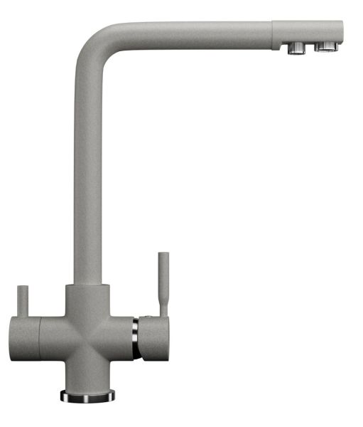 Высокоэргономичный кухонный смеситель с дополнительным краном для подключения фильтрованной воды, оснащенный кран-буксой с керамическими пластинами. Реализован тройной подвод воды через один излив: холодная, горячая и фильтрованная. Переход с одного подвода на другой производится поворотом рычага. Набор для соединения с фильтром входит в комплект. Система фильтрации приобретается дополнительно и монтируется под мойку, специальный индикатор сообщает о необходимости замены картриджа. Материал корпуса выполнен из высококачественной латуни, а окрашивание под искусственный камень в цвет мойки ULGRAN выполняется на собственном производстве, что позволяет идеально попасть в фирменный цвет ULGRAN. В качестве керамического картриджа используется известный бренд Wanhai диаметром 35 мм с высокой пропускной способностью в 500 тысяч циклов открывания-закрывания. На подвижные части картриджа Wanhai нанесена специальная невымываемая силиконовая смазка, а керамические пластины изготовлены из 96 процентов оксида алюминия, что, в сочетании с высоким качеством шлифовки обеспечивает долговечность, надежность, плавность хода рукоятки. Смеситель оборудован съемным пластиковым аэратором для экономии воды и поворотным изливом на 360 градусов. В комплектацию входят: керамический картридж Wanhai, гибкая подводка, комплект крепежных элементов, кран-букса с керамическими пластинами для дополнительного излива для фильтрованной воды, набор для подсоединения фильтра питьевой воды (гибкая подводка + переходник-цанга), технический паспорт и гарантийный талон.