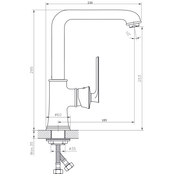 Смеситель для кухни с поворотным изливом RUSH арт. FL0835-22 с металлической ручкой из коллекции Flores изготовлен из высококачественной латуни и имеет рычажное управление. В смеситель установлен картридж D-35 с керамическими пластинами. Высота смесителя 295 мм. Излив поворотный, 185 мм. Высота излива до аэратора 253 мм. Аэратор изготовлен из пластика с нержавеющим корпусом, угол наклона аэратора- 10 гр. В комплекте гибкая подводка с латунными гайками 45 см - 2шт, универсальная присоединительная группа для установки на горизонтальную поверхность, фум-лента, индивидуальный пакет, паспорт, гарантийный талон.