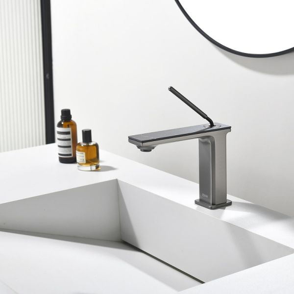 Смеситель для раковины датского производителя Black&White в цвете оружейная сталь. Корпус изготовлен из сантехнической латуни марки HPB 59– безопасного для здоровья сплава с высоким ресурсом. Управление потоком и настройка температуры воды происходит с помощью керамического картриджа повышенной пропускной способности, а на выходе для уменьшения разбрызгивания и экономии воды установлен аэратор. Важная стилистическая особенность —  накладка на излив изготовленная из керамогранита с текстурой  и рисунком серого мрамора. В формах продукта пересекаются цилиндрические и прямоугольные формы, что  гармонично может дополнить концепцию ванной комнаты в экостиле.
