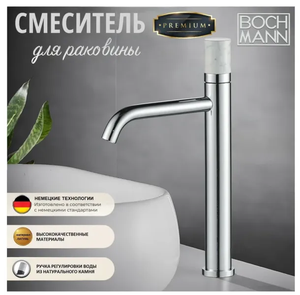 Смеситель STELLA Stone XL для раковины, с ручкой из НАТУРАЛЬНОГО КАМНЯ, цвет хром, высокий BOCH MANN BM9970 - идеальное решение для современной ванной комнаты. • Ультрамодный стиль и дизайн;• Специальное износостойкое покрытие, обеспечивающее изделию неизменный вид на протяжении долгих лет использования;• Эргономичное и плавное скольжение рычага включения воды;• Ручка управления выполнена из натурального камня.• Устойчивость к внешним повреждениям;• Премиальные материалы, используемые в производстве;• Легкий монтаж. Насколько длительным и беспроблемным будет срок службы смесителя, полностью зависит от качества материала его изготовления. Смесители из нержавейки редко покрывают защитным хромированным покрытием, так как оно им не нужно. Однако в этом кроется недостаток таких моделей, так как со временем они покрываются мельчайшими царапинками и мутнеют. Кроме того, к ним пристают известковые отложения, с которыми хозяйкам приходится бороться с помощью абразивов.Латунь в отличие от нержавеющей стали легче принимает нужную форму, ей проще манипулировать в процессе создания изделия - возможно придать разные формы. Для реализации дизайнерских идей латунные смесители дополнительно покрывают различными составами. Обработанные поверхности обладают антисептическими характеристиками, препятствуя размножению бактерий, легко моются.Смесители BOCH MANN изготовлены из Латуни, которая считается самым надежным, износостойким и долговечными материалом, а также отличается стойкостью к коррозии и известковому налету.В процессе эксплуатации сантехники никаких поломок или проблем с латунными смесителями не возникает.Поэтому если Вы хотите приобрести качественный и современный смеситель, который даже спустя десятилетие будет радовать Вас не только покрытием, но и исправной работой, предлагаем Вам обратить внимание на смеситель для раковины BOCH MANN STELLA Stone XL BM9970 Внимание! Производитель оставляет за собой право вносить изменения в конструкцию и комплектацию моделей без предварительного уведомления!
