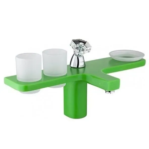 Смеситель для умывальника Gappo Giron G1096-9 — оригинальная однорычажная модель в комплекте с аксессуарами. Корпус выполнен в виде полочки, рычаг управления в форме кристалла расположен по центру. Модель изготовлена из латуни и кварцевого камня. В комплекте аксессуары для ванной комнаты: два стакана и мыльница. Цвет смесителя — зеленый.