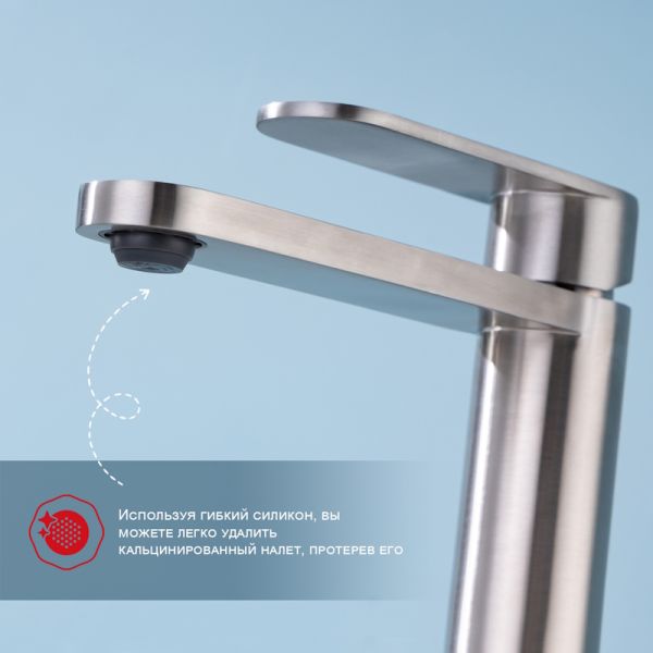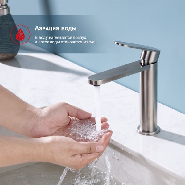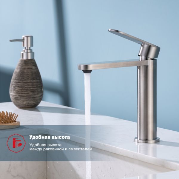 Смеситель для раковины R10.10.05. Однорычажный смеситель для раковины (для умывальника) в ванную, выполненный в цвете "сатин" (матовый хром). Соответствует требованиям международного стандарта. Одна рукоять для регулировки воды. Аэратор для водопроводной воды Neoperl® гарантирует одинаковый поток воды, сеточка рассеивает напор, вода смягчается. Смеситель устанавливается на гайке, нижняя часть смесителя вставляется в отверстие для монтажа и затягивается гайкой для фиксации. Данный смеситель для умывальника имеет надежный стационарный излив, не меняющий своего положении. Смеситель прекрасно смешивает потоки воды, а помимо этого обладает невысоки показателем шумов. Быстрый монтаж. Гарантия производителя 5 лет.