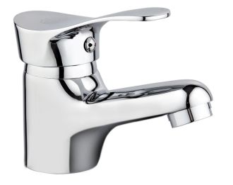 Аккуратный однорычажный смеситель для умывальника с округлыми очертаниями форм идеально подойдет для негабаритной раковины.