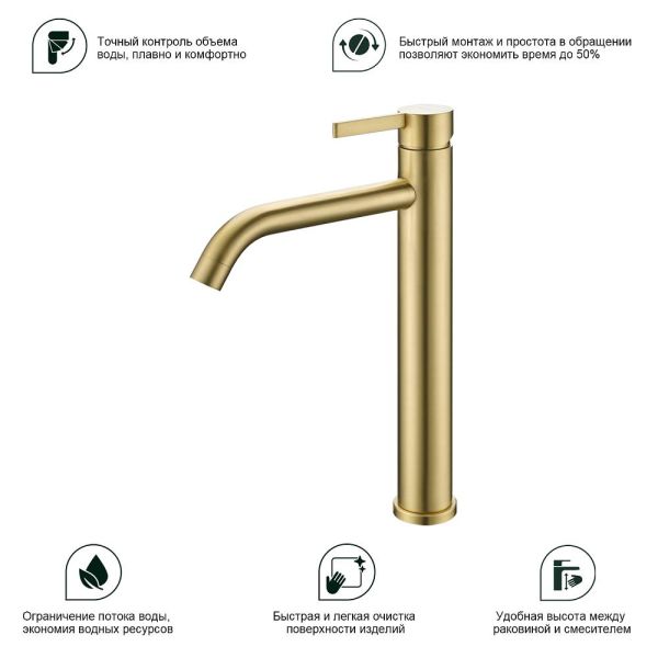Смеситель выполнен в цвете «золотой сатин», который придаст вашей ванной комнате изысканность и элегантность.