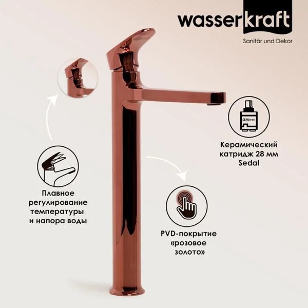 Смеситель для раковины Wasserkraft Asphe 7703H розовое золото купить