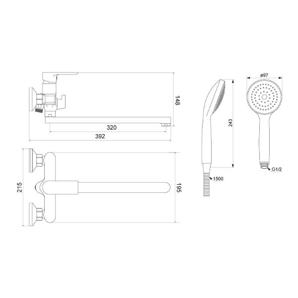 Диамтер ручного душа: 97 мм.