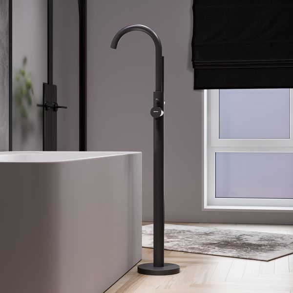 Смеситель для ванны и душа Damixa Scandinavian Pure 365000300 черныйКорпус смесителя 1 шт.; излив 1 шт.; кронштейн крепления 1 шт.; комплект крепежный 1 шт.; ручной душ 1 шт.; шланг 1 шт.; гибкая подводка 2 шт.; декоративная розетка 1 шт.; инструкция изделия. Хром, высокий отдельностоящий смеситель для ванны и душа, ручка Stick
