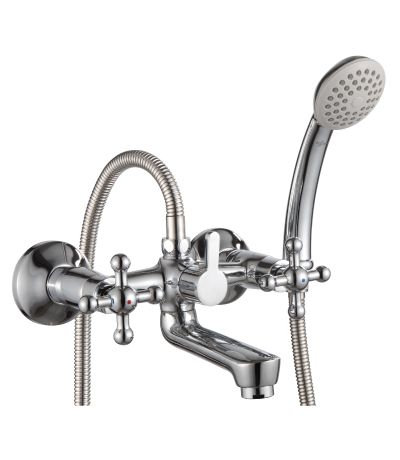Смеситель Rossinka G02-83 для ванны. Пластиковый аэратор с функцией легкой очистки, керамические вентильные головки, переключатель с керамическими пластинами. Аксессуары в комплекте (шланг 1,5 м, настенное крепление, 1-функциональная лейка с функцией легкой очистки) Присоединительная группа (эксцентрики с отражателями) для вертикального крепления.