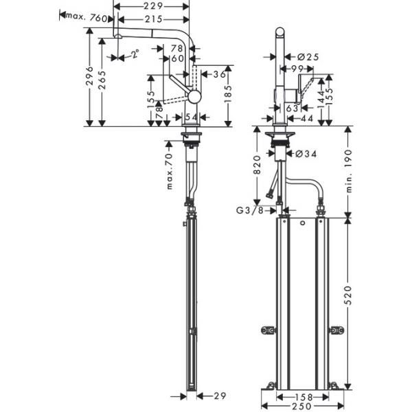 • • угол поворота излива: регулировка на 4 уровня 60 °, 110 °, 150 ° или 360 °