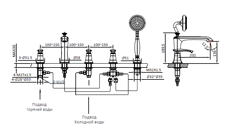 Смеситель на борт ванны с душем AltroBagno Beatrice 020103 Or купить