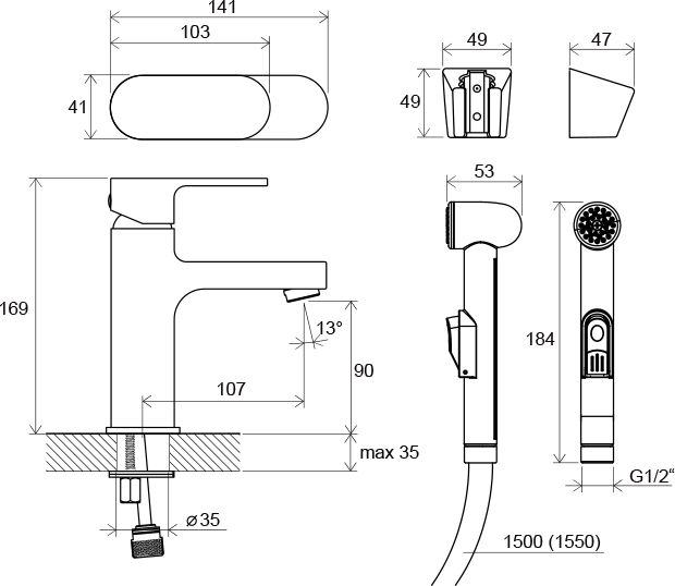 • исполнение: с ручным гигиеническим душем и настенным держателем