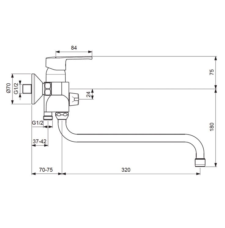 UNO Настенный смеситель для ванны/душа, поворотный излив 320 мм, душевой гарнитур в комплекте (душевая лейка 70 мм, металлический шланг 1500 мм, держатель для лейки).Смеситель однорычажный