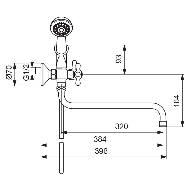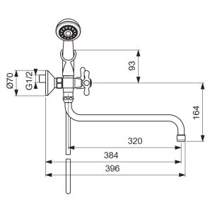 UNO Настенный смеситель для ванны/душа поворотный излив квадратной формы, душевой гарнитур в комплекте (душевая лейка Ø70 мм, металлический шланг 1500 мм, держатель для лейки).