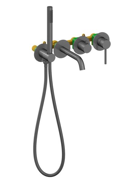 "Черное золото"- неизменно эффективный и привлекающий внимание цвет. Приглушенный мягкий оттенок черного, подчекнет форму раковины или цвет мебели. Встраиваемый смеситель Timo Saona 2314 предназначен для монтажа в твердой или полой стене. Уникальная дизайнерская модель с раздельными горизонтальными блоками, создаст неповторимый современный интерьер в ванной комнате. Основные преимущества встроенного смесителя: коммуникации, крепления и механизмы спрятаны в стену и видны только декоративные элементы, установить встроенный смеситель можно в любом месте. Стильная лейка-карандаш удобна в использовании и фиксируется в держателе с подключением душа. Регулировка температуры и напора воды осуществляется джойстиком справа. Переключение потока воды с излива на ручную лейку осуществляется поворотом ручки дивертора. Сложностей монтажа не возникает при установке смесителя опытным сантехником. Внимательно изучите инструкцию по монтажу и эксплуатации. Цвет "черное золото" не капризен в уходе, на нем менее заметны загрязнения и мелкие царапины.