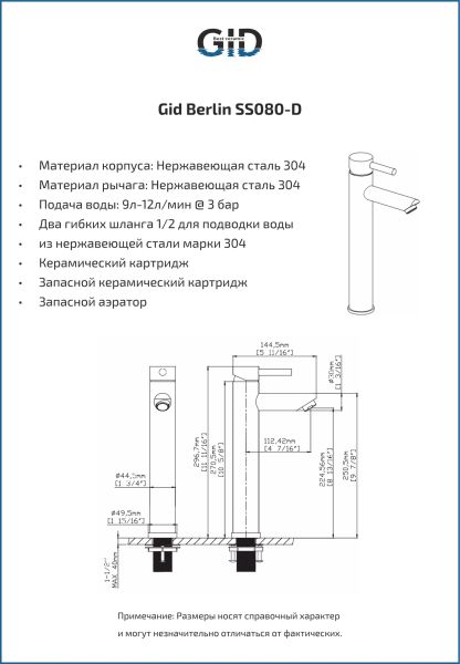 Смеситель высокий для раковины Gid Berlin SS080-BM-D SS080BMD черный матовый