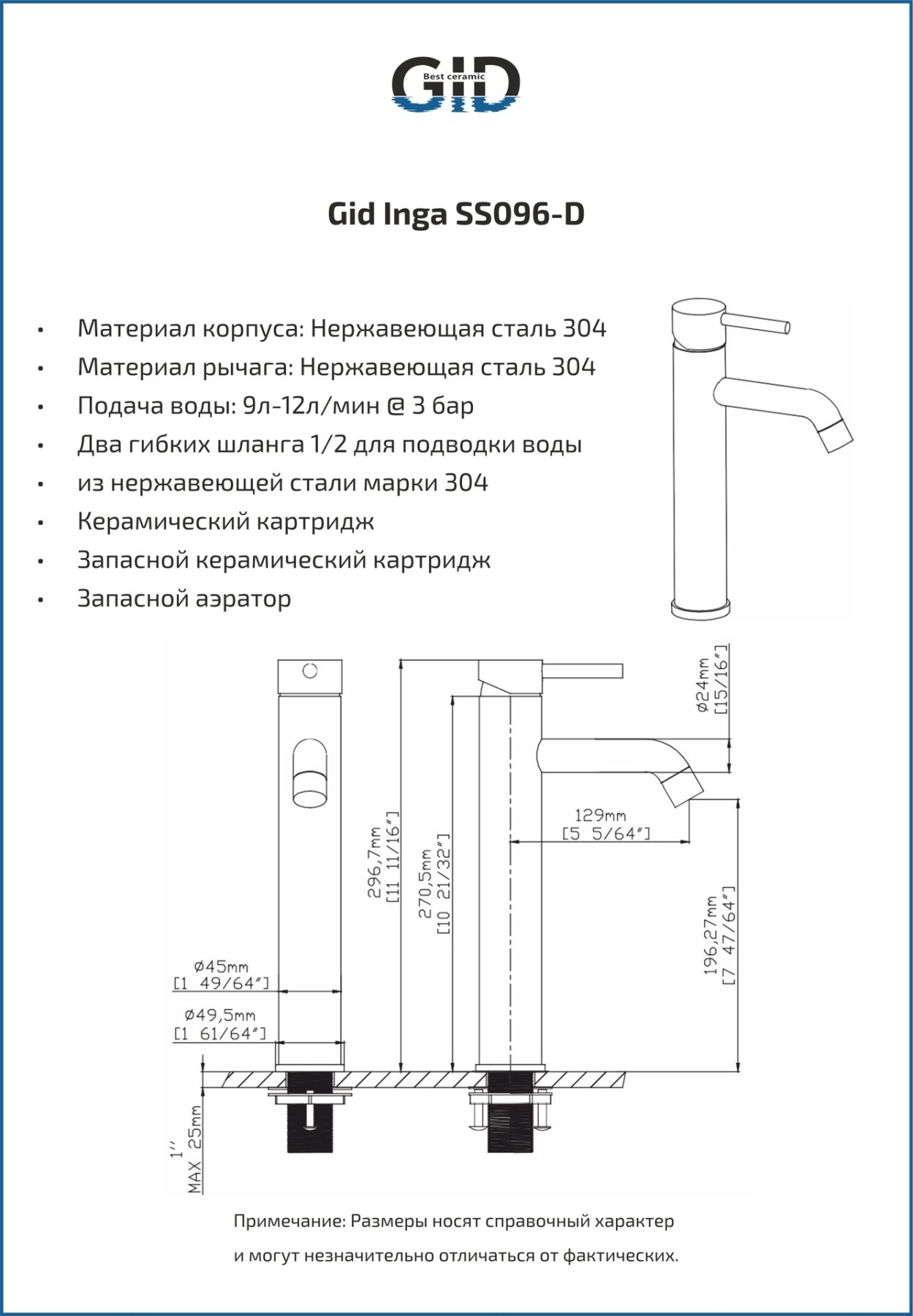 Cascada – Смелый дизайн и нестандартные формы сочетаются с испанским качеством и европейскими стандартами. Эти смесители превращают каждый поток воды в динамичное произведение искусства. Смеситель GID Inga SS096-CH-D — удлиненная модель в стильном хромированном цвете, созданная для раковин в современных ванных комнатах. Изготовленный из высококачественной нержавеющей стали, он отличается долговечностью и устойчивостью к коррозии. Название «Inga» отсылает к знаменитому водопаду Инга на реке Конго — одному из крупнейших водопадов мира, известному своей мощью и стремительным потоком воды. Эта модель воплощает энергию и силу природы, сочетая функциональность с элегантным дизайном. Комплект: смеситель  Inga SS096-CH-D; 2 шланга подачи воды, дополнительные аэратор и керамический картридж; шестигранный ключ.