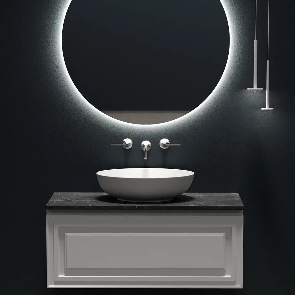 Столешница для ванной комнаты из керамогранита, для установки на подвесную тумбу. C готовым отверстием для установки накладной раковины. Без заранее просверленного отверстия под смеситель.