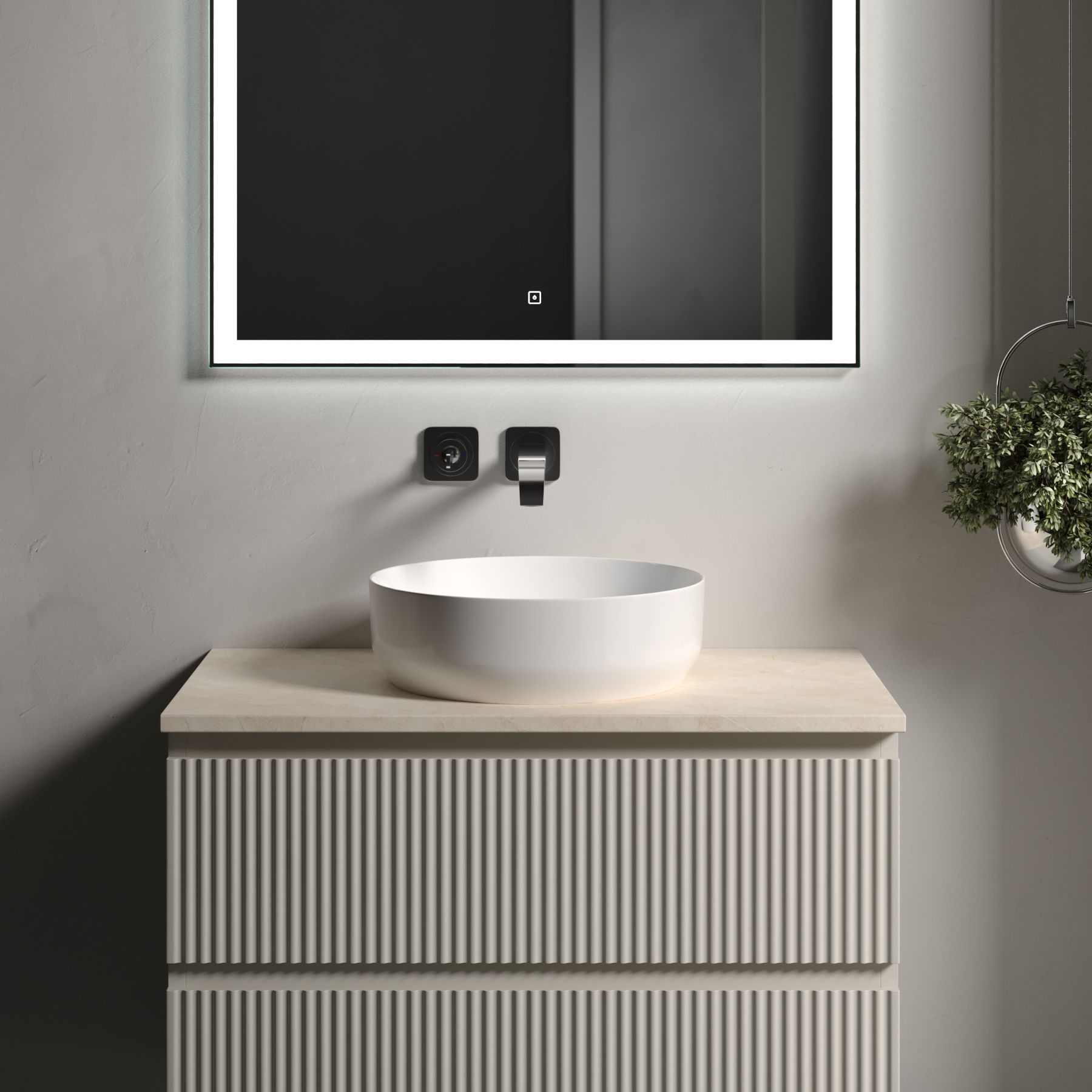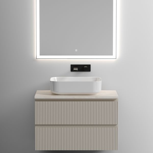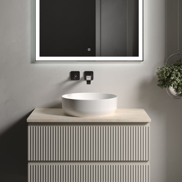 Столешница для ванной комнаты из керамогранита, для установки на подвесную тумбу. C готовым отверстием для установки накладной раковины. Без заранее просверленного отверстия под смеситель.