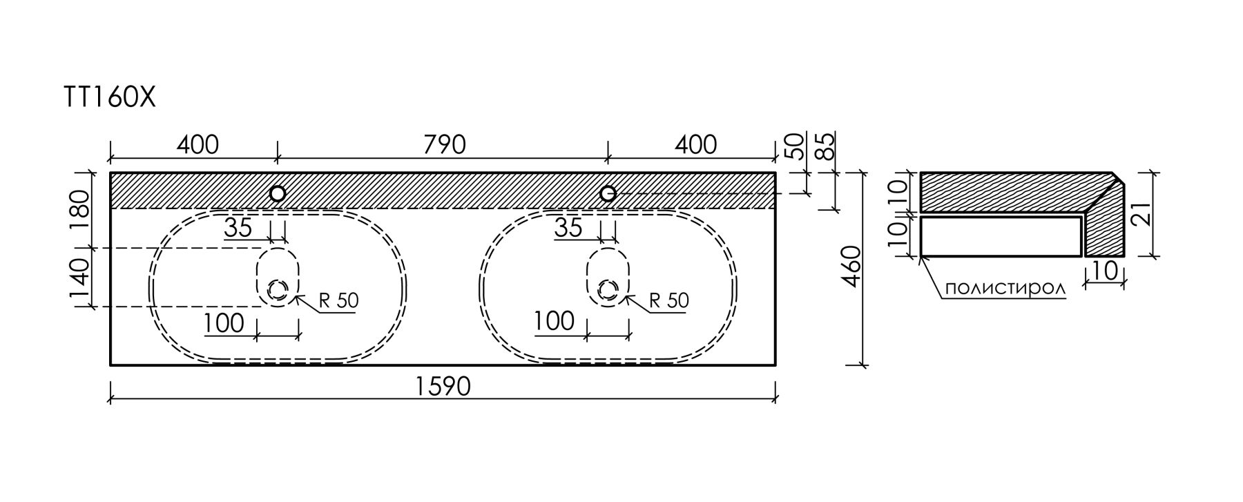 • Столешница с просверленным отверстием под смеситель.