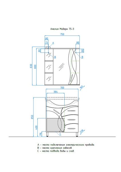 Тумба напольная "Амелия" с 3 ящиками и декоративной фрезеровкой фасада. Фурнитура - хром, петли на дверцах с механизмом плавного закрывания. Направляющие полного выдвижения Hettich, обеспечивающие плавность и бесшумность хода, высокую надежность и прочность. Данная тумба предусматривает открытую подводку воды
