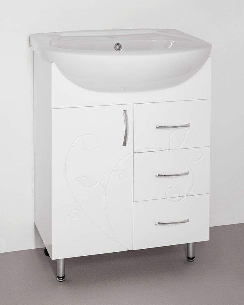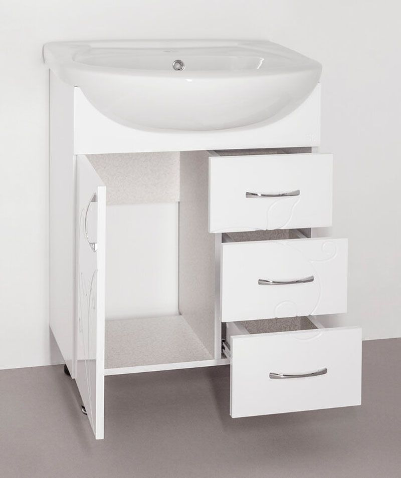 Тумба напольная бренда "Style Line" Эко Фьюжн 24 с 3 ящиками. Фурнитура - хром, тонкая элегантная декоративная фрезеровка фасадов. Направляющие полного выдвижения Hettich; эксклюзивный декор "Луино" - ламинация внутренней стороны изделия; сборка изделия с помощью эксцентриковых стяжек Hafele; все материалы полностью влагостойкие. Данная тумба предусматривает открытую подводку воды