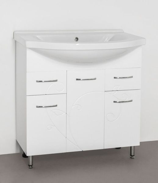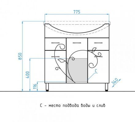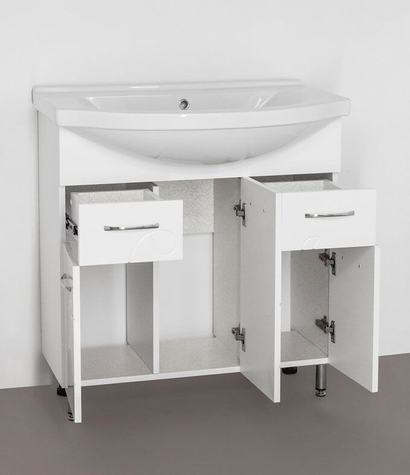 Тумба напольная бренда "Style Line" Эко Фьюжн 26 с 2 ящиками. Фурнитура - хром, тонкая элегантная декоративная фрезеровка фасадов. Направляющие полного выдвижения Hettich; эксклюзивный декор "Луино" - ламинация внутренней стороны изделия; сборка изделия с помощью эксцентриковых стяжек Hafele; все материалы полностью влагостойкие. Данная тумба предусматривает открытую подводку воды