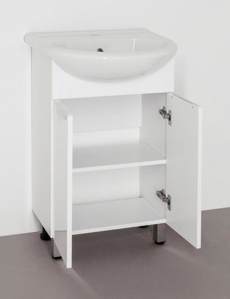Тумба напольная бренда "Style Line" коллекции "Жасмин" со стильными врезными ручками. Фурнитура - хром, направляющие полного выдвижения Hettich; сборка изделия с помощью эксцентриковых стяжек Hafele; все материалы полностью влагостойкие. Данная тумба предусматривает открытую подводку воды