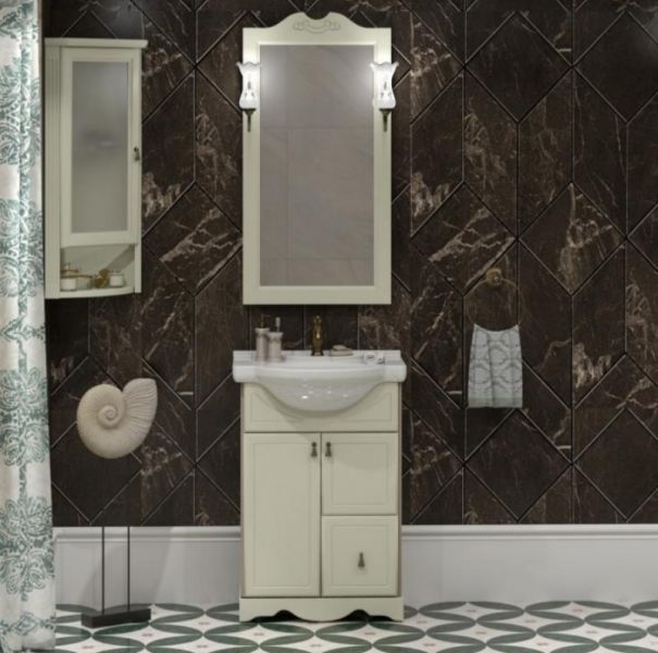 Зеркальный шкаф оборудован одним врезным светодиодным светильником 220В и розеткой с выключателем. Справа - шкафчик с распашным фасадом со стеклянной вставкой. Внутри - одна встроенная полочка. Петли со встроенным доводчиком, ручка врезная- 1шт. Выпускается только в правом исполнении.