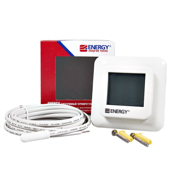 Energy TK07 - электронный терморегулятор с крупным сенсорным жидкокристаллическим дисплеем 40 мм х 35 мм и выносным датчиком температуры пола. Предназначен для скрытого утопленного монтажа с использованием стандартной монтажной коробки. Размеры регулятора соответствуют европейским стандартам.Диапазон регулирования температуры: +5°С - +40°С. Высокая точность установки температуры 0,5°С существенно сокращает время работы тепловой системы и снижает расходы на потребляемую электроэнергию.Управление термостатом осуществляется тремя сенсорными кнопками на поверхности жидкокристаллического дисплея. Также на дисплее крупными символами отображается информация о режимах работы, текущей и заданной температуре. При нажатии кнопок автоматически загорается синяя неоновая подсветка, поэтому терморегулятором легко управлять даже в темном помещении.Терморегулятор Energy TK07 имеет класс защиты IP 21, подходит для помещений с повышенной влажностью.