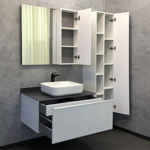 COMFORTY. Тумба-умывальник "Милан-90" белый глянец с графитовой столешницей, с раковиной COMFORTY T-Y9378Подвесная тумба-умывальник в современном стиле с выкатным ящиком оснащенным системой с плавного закрывания. За основным фасадом скрывается внутренний ящик оснащенный системой push-to-open (открытие при нажатии). Тумба укомплектована столешницей и плинтусом из керамогранита светло-серого цвета и накладной прямоугольной раковиной. Фасады покрыты белой глянцевой эмалью.Тумба подготовлена для подключения водоснабжения снизу.Основные характеристики:Монтаж: подвесной