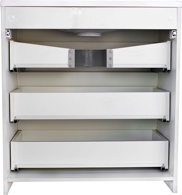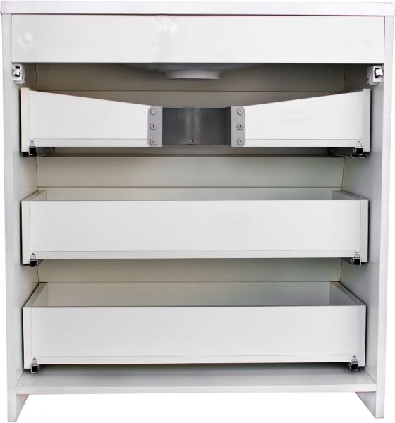 Тумба коллекции Атлантика выполнена в современном стиле с преобладанием прямых строгих линий в дизайне. Она сочетает в себе функциональность и обеспечит удобное хранение ванных принадлежностей. Для размещения ванных аксессуаров в тумбе предусмотрено три выдвижных ящика. Особенностью модели является возможность установки под нее стиральной машины. Тумба отлично впишется в интерьер ванной комнаты в современном дизайне