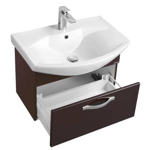 В тумбе за фасадом расположен ящик из влагостойкой ДСП со вставками, организующими его пространство. Ящик установлен на направляющие полного выдвижения немецкого производителя фурнитуры GRASS, благодаря чему им удобно пользоваться даже с керамической раковиной, выступающей вперед.Тумба для комплекта Акватон Ария 65 темно-коричневая не только не только функциональный предмет интерьера ванной комнаты, но прекрасное эргономичное дополнение дизайна, как небольшого, так и крупного помещения. Подвесной способ установки дает возможность не только визуально увеличить пространство, но и обеспечивает быстрый и удобный доступ для уборки.Компания Акватон использует при производстве высококачественные водоотталкивающие материалы (ДСП), соответствующие всем необходимым требованиям безопасности. Серия Ария отличается превосходным дизайном с соблюдением всех значимых элементов современного стиля. Основным цветом, в котором выполнена тумба под раковину Акватон Ария является коричневый, отлично подходящий большинству дизайнерских решений. Тумба под раковину предусматривает удобную и вместительную систему хранения, состоящую из ящиков. Качественные доводчики позволяют обеспечить мягкое и тихое закрывание. Важные размеры товара: ширина 59.4 см, глубина 31 см, высота 44.2 см.Страной бренда Акватон является Россия, все товары производятся с выполнением соответствующих стандартов качества, что позволяет быть полностью уверенными в долговечности и надежности. Тумба для комплекта Акватон Ария 65 темно-коричневая правильный выбор в современном дизайне ванной, придающий уникальность всему помещению, при этом сохраняя функциональность.