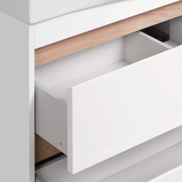 Тумба для комплекта Акватон Нортон 80 несравненно впишется в дизайн любой ванной комнаты, будь то компактная ванная в многоэтажном доме или большой санузел в загородном коттедже. Подвесной способ установки дает возможность не только визуально увеличить пространство, но и обеспечивает быстрый и удобный доступ для уборки.Компания Акватон использует при производстве высококачественные водоотталкивающие материалы (ДСП), соответствующие всем необходимым требованиям безопасности. Серия Нортон отличается превосходным дизайном с соблюдением всех ключевых элементов современного стиля. Основным цветом, в котором выполнена тумба под раковину Акватон Нортон является белый, отлично подходящий большинству дизайнерских решений. Тумба под раковину предусматривает удобную и вместительную систему хранения, состоящую из ящиков. Качественные доводчики позволяют обеспечить мягкое и тихое закрывание. Ключевые габариты изделия: ширина 76 см, глубина 35.7 см, высота 55.4 см.Страной бренда Акватон является Россия, все товары производятся с выполнением соответствующих стандартов качества, что позволяет быть полностью уверенными в долговечности и надежности. Тумба для комплекта Акватон Нортон 80 это абсолютный комфорт в современной ванной комнате.