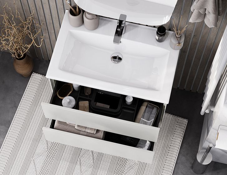 Тумба Сохо 75 функционально состоит из двух вместительных ящиков, оснащенных системой push to open, обеспечивающей надежное, комфортное и бесшумное закрывание. Фасады изделия выполнены из МДФ в пленке в цвете галька серая, корпус из ламинированной влагостойкой ДСП слэйт. Верхний и нижний ящики оснащены системой организации пространства, которая позволяет содержать косметические средства в идеальном порядке. Дополняет тумбу стильная раковина Элина от бренда Santek с удобной чашей. Все внутренние детали тумбы выполнены в цвете антрацит.