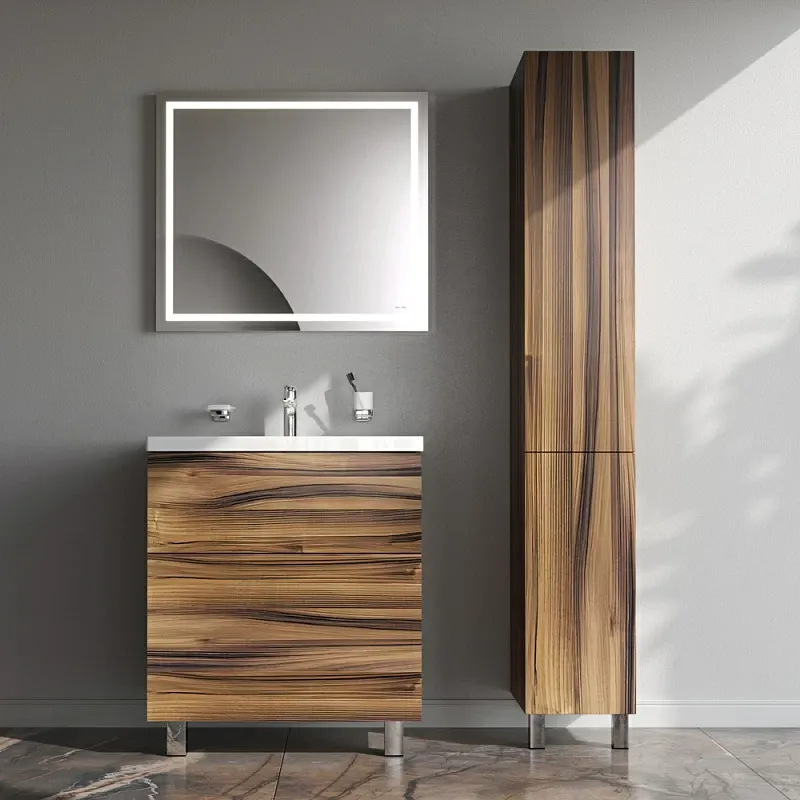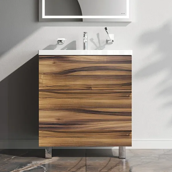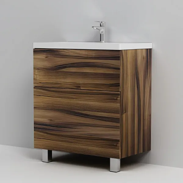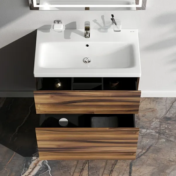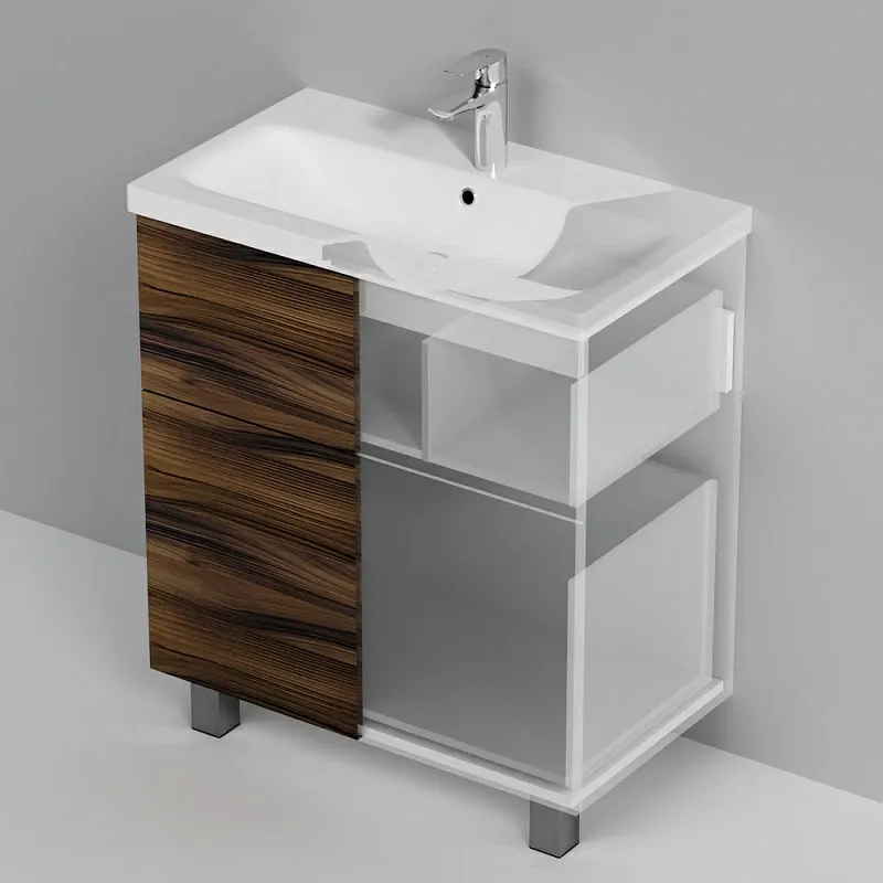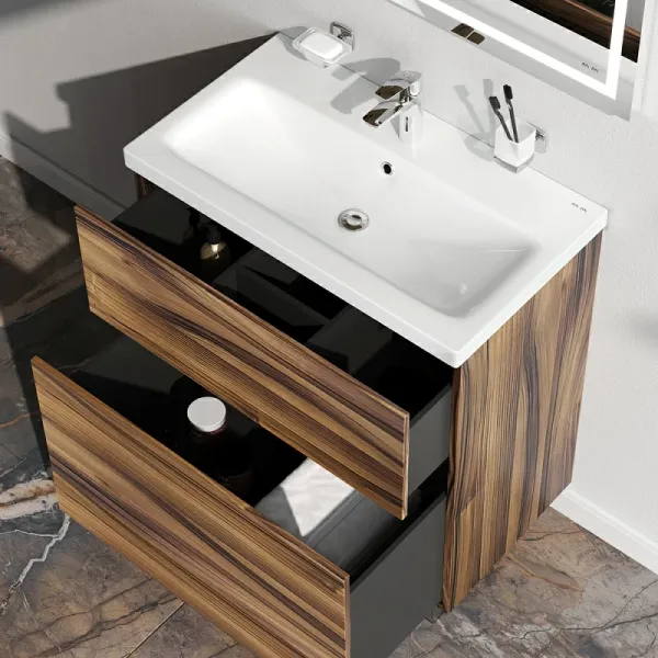 Представляем расширение цветовой палитры коллекции Gem в цвете “орех”. Напольная база под раковину изготовлена из влагостойкого ЛДСП. Внутреннее пространство двух вместительных ящиков представлено в цвете антрацит с антискользящим эффектом.