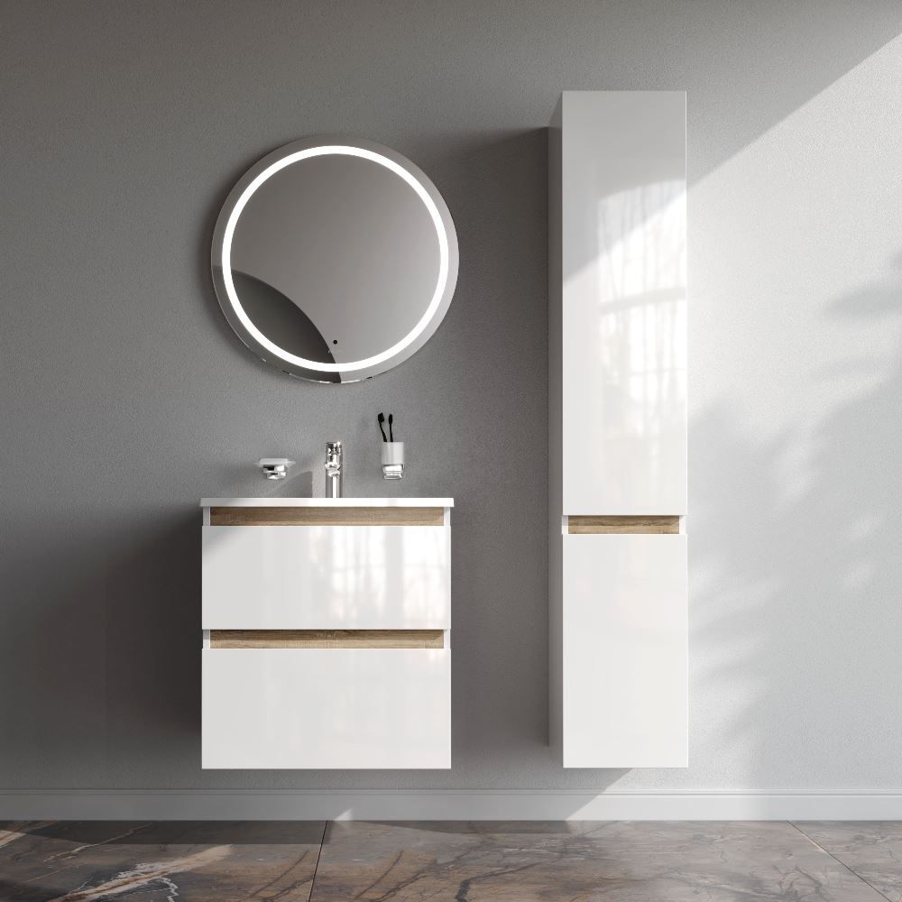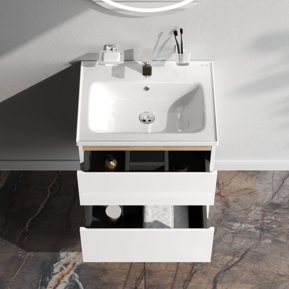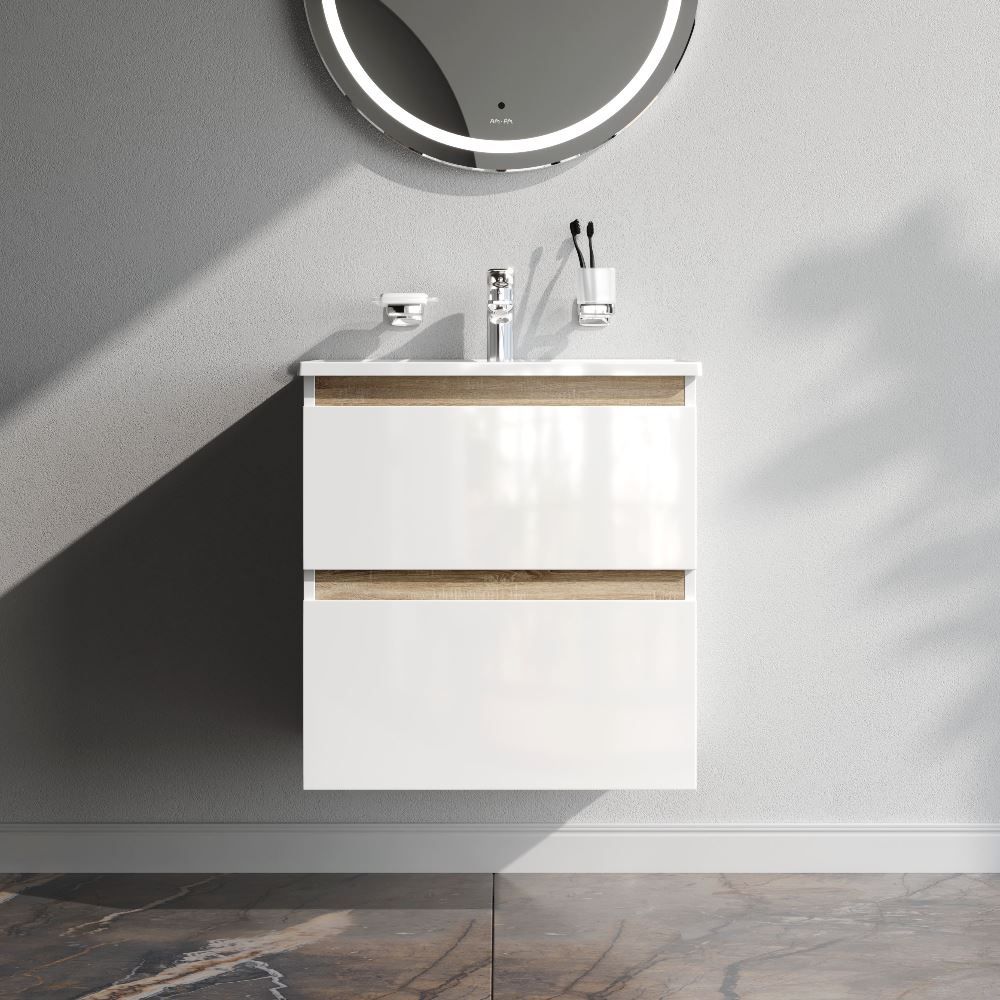 Подвесная тумба бренда AM.PM коллекции X-Joy с белыми глянцевыми фасадами, дополненными отделкой под светлое дерево. Функциональный органайзер в первом ящике позволит хранить необходимые косметические средства под рукой и в полном порядке. Внутреннее покрытие каждого ящика выполнено в современном цвете "антрацит" и имеет противоскользящее покрытие.​ Материал и покрытие корпуса - влагостойкий ЛДСП. Материал фасада - МДФ. Покрытие фасада - высококачественные итальянские краски и эмали. Размер тумбы (Ш/Г/В): 590x450x620. Цвет тумбы - белый глянец.