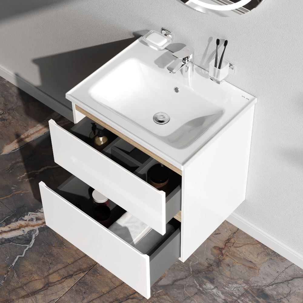 Подвесная тумба помогает сэкономить место в ванной комнате, визуально увеличивая пространство. Установка на удобной высоте. Оптимизация хранения вещей внутри ящиков. Грамотно расположенные скрытые коммуникации внутри тумбы. Бортик по контуру раковины препятствует проливу воды за мебель. Сантехнический фарфор - долговечный и прочный материал, обладающий высокой гигиеничностью.