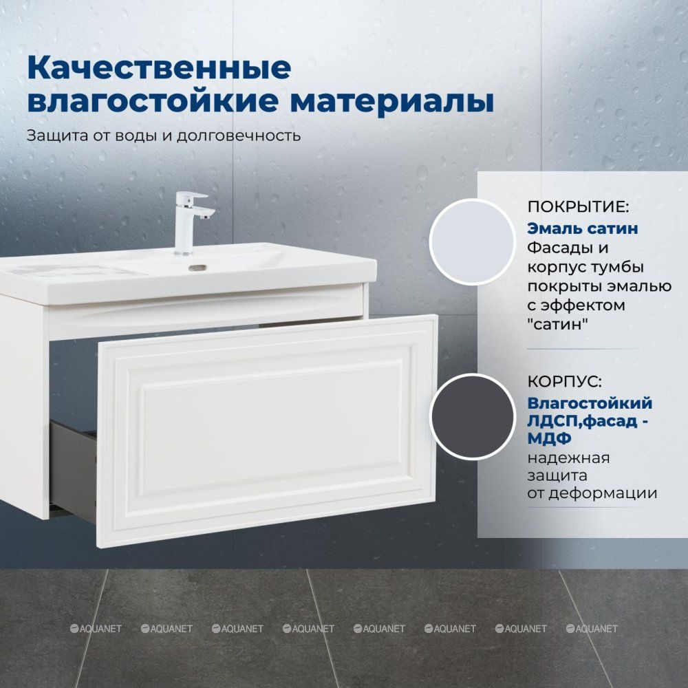 Тумба под раковину Aquanet Агата 90  белый сатин — это стильное и функциональное решение для ванной комнаты. Она сочетает в себе прочность, устойчивость к влаге и продуманную конструкцию.