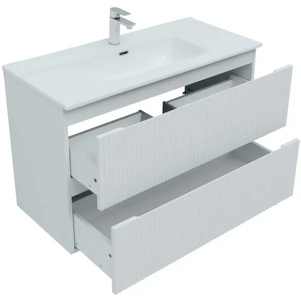 Тумба под раковину Aquanet Джейн (Flat) 100 белый матовый — практичное и стильное решение для ванной комнаты. Корпус и фасады изготовлены из МДФ, покрытого суперматовой пленкой ПВХ повышенной прочности с эффектом «Soft touch». Покрытие не только приятное на ощупь, но и надежно защищает мебель от влаги. Полимерная структура пленки не пропускает воду, поэтому тумба не деформируется со временем и сохраняет первоначальный вид.