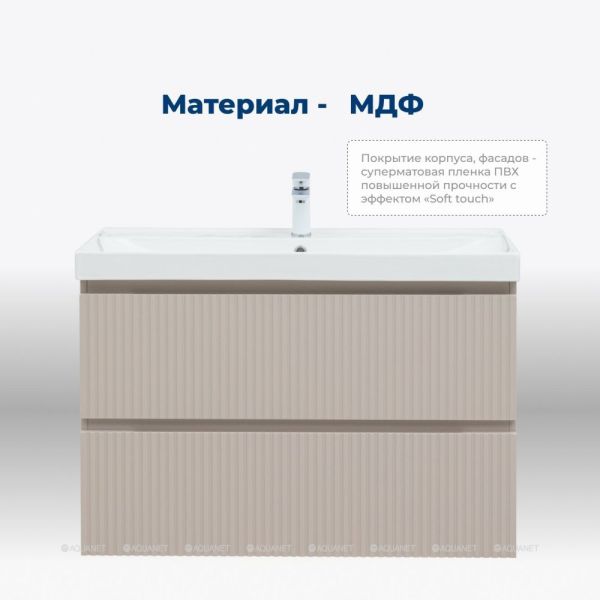Тумба под раковину Aquanet Джейн (Flat) 90 бежевый — практичное и стильное решение для ванной комнаты. Корпус и фасады изготовлены из МДФ, покрытого суперматовой пленкой ПВХ повышенной прочности с эффектом «Soft touch». Покрытие не только приятное на ощупь, но и надежно защищает мебель от влаги. Полимерная структура пленки не пропускает воду, поэтому тумба не деформируется со временем и сохраняет первоначальный вид.