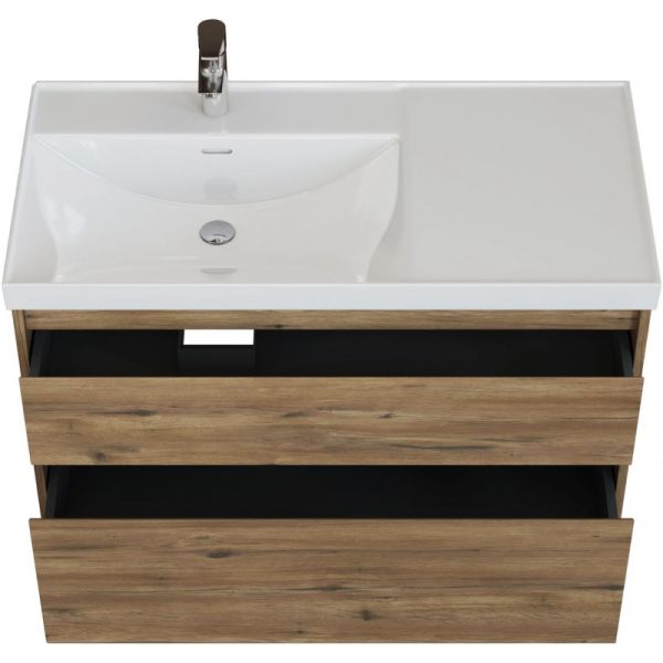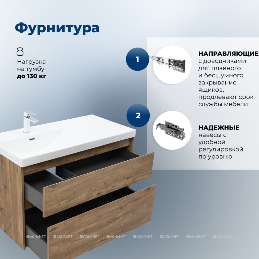 Стильная и практичная тумба для ванной комнаты с продуманной конструкцией. Модель Aquanet Nova Lite 2.0 100 выполнена в цвете дуб рустикальный – матовое покрытие имитирует фактуру натурального дерева и не оставляет отпечатков пальцев.