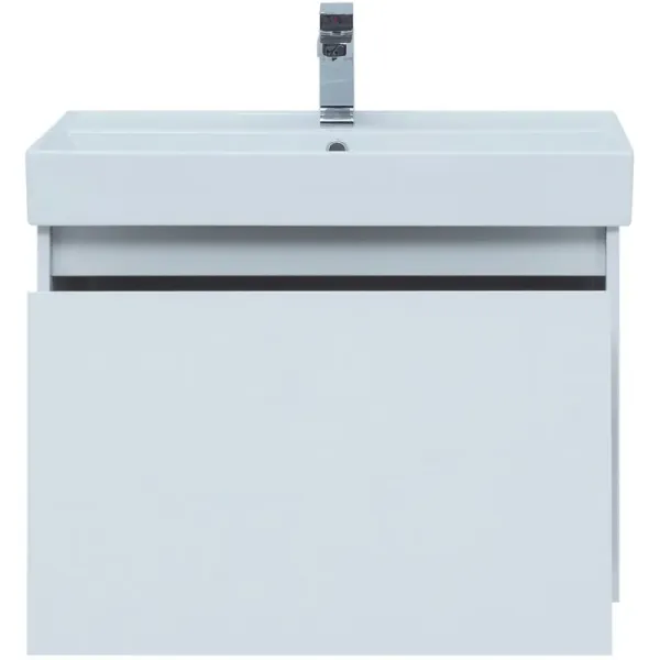 Тумба под раковину Aquanet Nova Lite 75 белоснежного цвета из влагостойкой ламинированной древесно-стружечной плиты выглядит нарядно. Подвесной монтаж придает визуальную легкость тумбе шириной 75 см. Тумба оборудована одним большим ящиком, внутри которого предусмотрен маленький с выемкой для установки сифона и разделителями, где удобно хранить необходимые в ванной комнате мелочи. Фасады выполнены с декоративной интегрированной ручкой, не имеющей острых краев и внутренних углов, что обеспечивает удобство в эксплуатации и легкий уход за мебелью. Направляющие с доводчиками, так что при открывании и закрывании ящикам обеспечен плавный ход и отсутствие неприятных стуков. Неглубокая и стильная керамическая раковина «Латина» идеально подходит к тумбе.