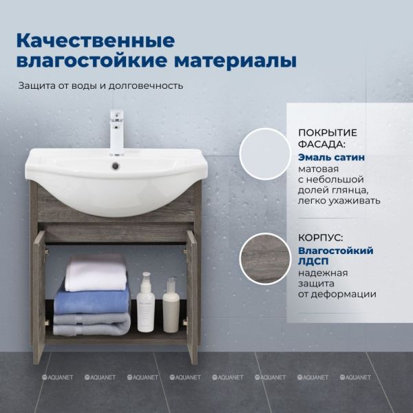 Тумба Aquanet Сидней 60 идеально подойдет для небольших ванных комнат. Ее компактные размеры не мешают размещению просторной керамической раковины с глубокой чашей. Двухцветное оформление "дуб рошелье/белый" делает модель универсальной для разных стилей интерьера.