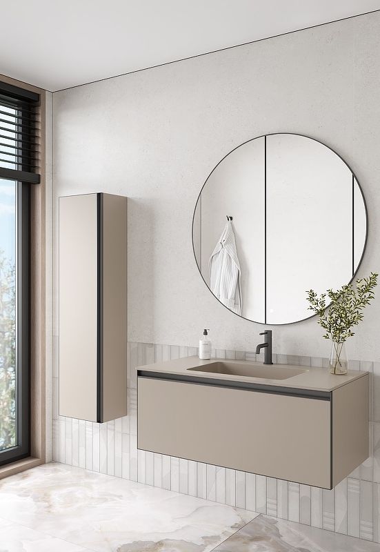 Главной особенностью коллекции являются обрамления фасадов из алюминия в самых трендовых цветах: графит, матовое золото, матовый черный и серебро. Эти обрамления идеально дополняют сантехнику в ванной комнате.