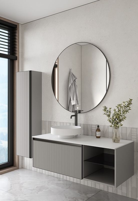 Главной особенностью коллекции являются обрамления фасадов из алюминия в самых трендовых цветах: графит, матовое золото, матовый черный и серебро. Эти обрамления идеально дополняют сантехнику в ванной комнате.