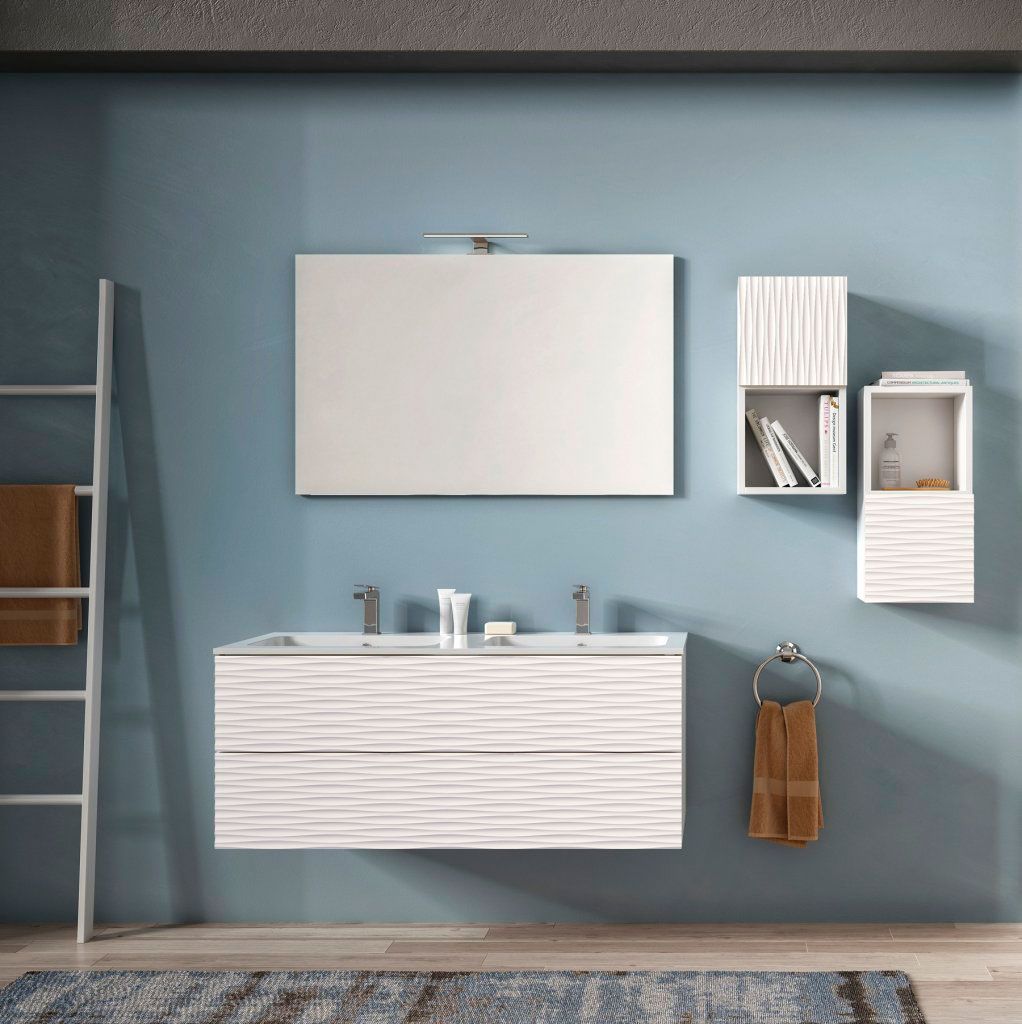 Объемная, вместительная тумба с выдвижными ящиками. Комплект можно дополнить оригинальными подвесными шкафчиками. “Трехмерный» рисунок на фасаде навевает мысли о белоснежном песчаном пляже. Представленная цветовая палитра в матовом лаке, дает возможность выбора для заказа.