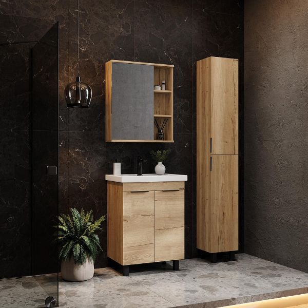 Напольная тумба для ванной комнаты Onika Легран 50 - это сочетание насыщенного древесного декора и благородства металла: роскошная текстура и натуральный цвет дуба дают теплоту, а черная матовая фурнитура добавляют урбанизма и солидности.