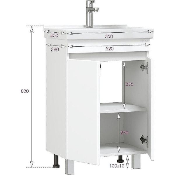 Размеры тумбы без учета раковины и ножек 52x38x68 см.
