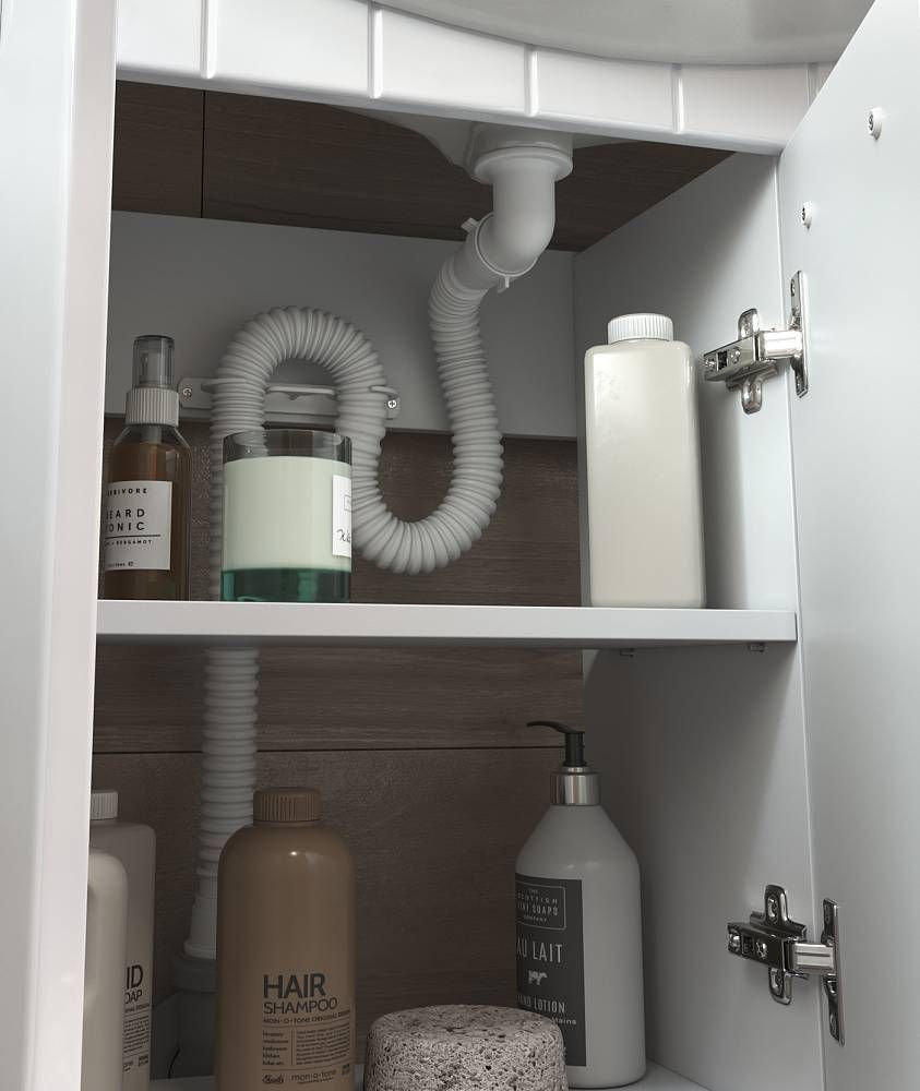 Оснащение: 1 дверца, 2 выдвижных ящика, 1 полка ЛДСП, направляющие шариковые полного выдвижения, петли с механизмом доводчика, 2 опоры квадратные регулируемые, 2 опоры кухонные, сифон
