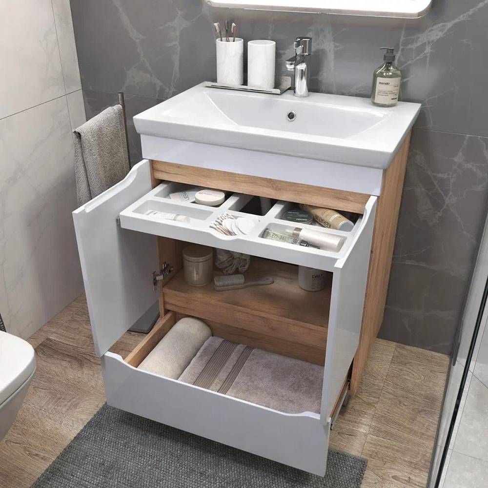 Тумба под раковину напольная VIGO Grani 285 дуб золотой, 70 см. Гарантийный срок 2 года. Монтаж: напольный. Доводчик: да. Нажимной механизм: нет.